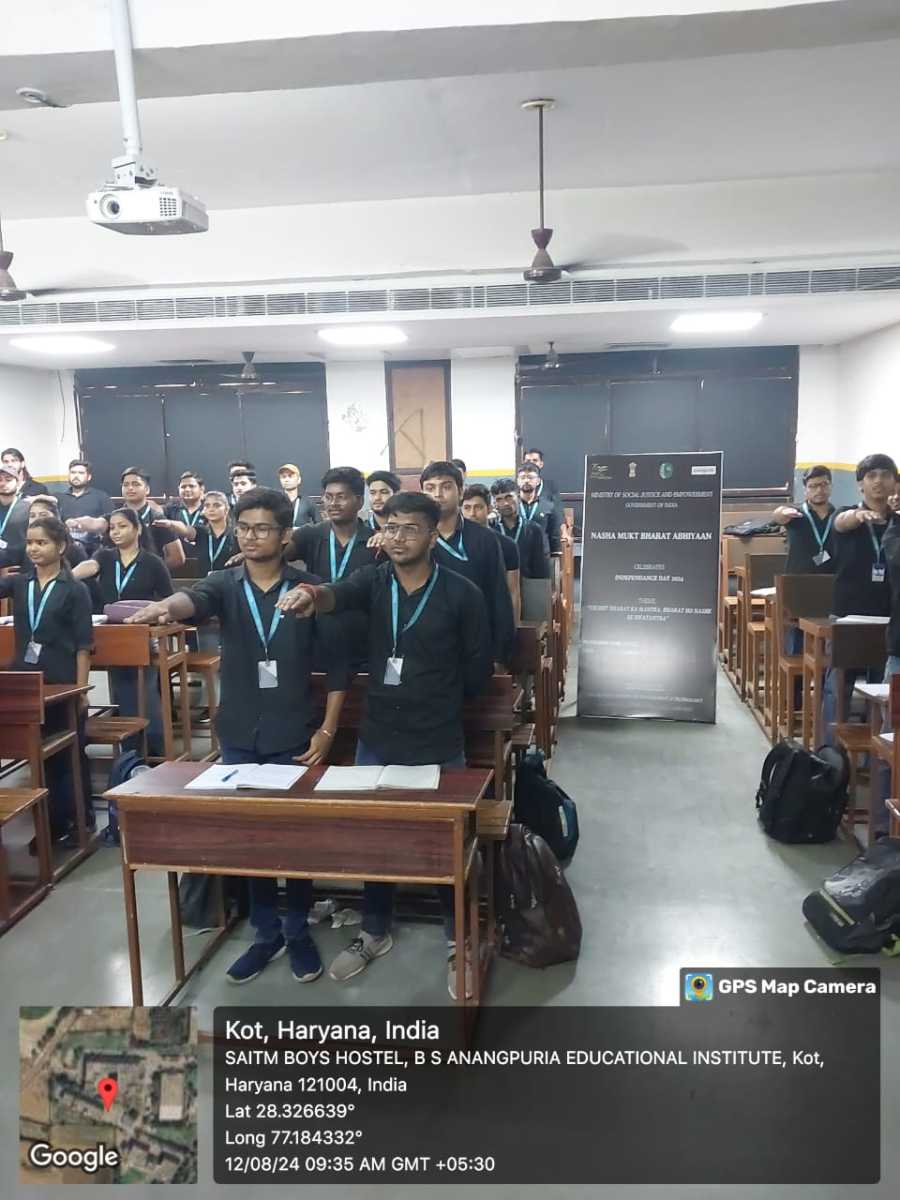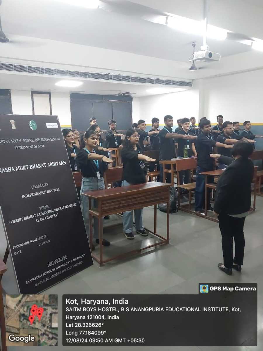 Students and staff of Anangpuria School of Management & Technology took the vow as our nation commemorated “Nasha Mukt Bharat Abhiyan” on August 12, 2024, during the “Nashe se Azadi National Youth and Students Interaction Program.” As part of the Nasha Mukt Bharat Abhiyaan Campaign (NMBA)/Drug Free India campaign against substance misuse, students from Anangpuria School of Management & Technology pledged to abstain from narcotics and work towards making India drug-free. The ceremony’s main objective was to increase collaboration and action in the direction of a sustainable, drug-free future. All the Students pledged to abstain from drugs and work toward making India a drug-free nation on this special day.